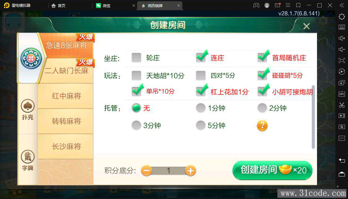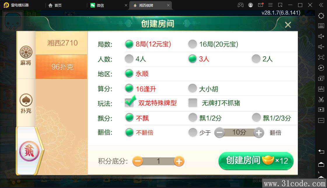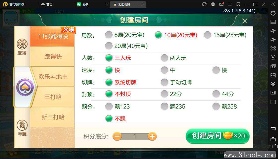 七星湘西地级市湘西麻将扑克字牌房卡端12子游戏+亲友圈乐豆模式+比赛模式+双端 附件 文件名: 七星定制湘西 提取码: ****(需购买后查看) 解压密码: ****(需购买后查看) 下载文件 附件购买 售价:168 积分 开通VIP或更高级的会员可免费下载该文件 请登录 或 注册购买 这里是自定义内容,请在【用户中心配置 - 销售配置 - 附件下载 - 未登录提示】修改 房卡约战类 转载请说明出处 内容投诉31棋牌源码资源网 » 七星湘西地级市湘西麻将扑克字牌房卡端12子游戏+亲友圈乐豆模式+比赛模式+双端