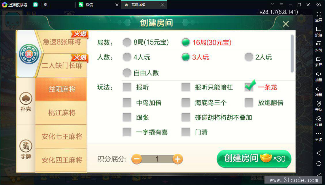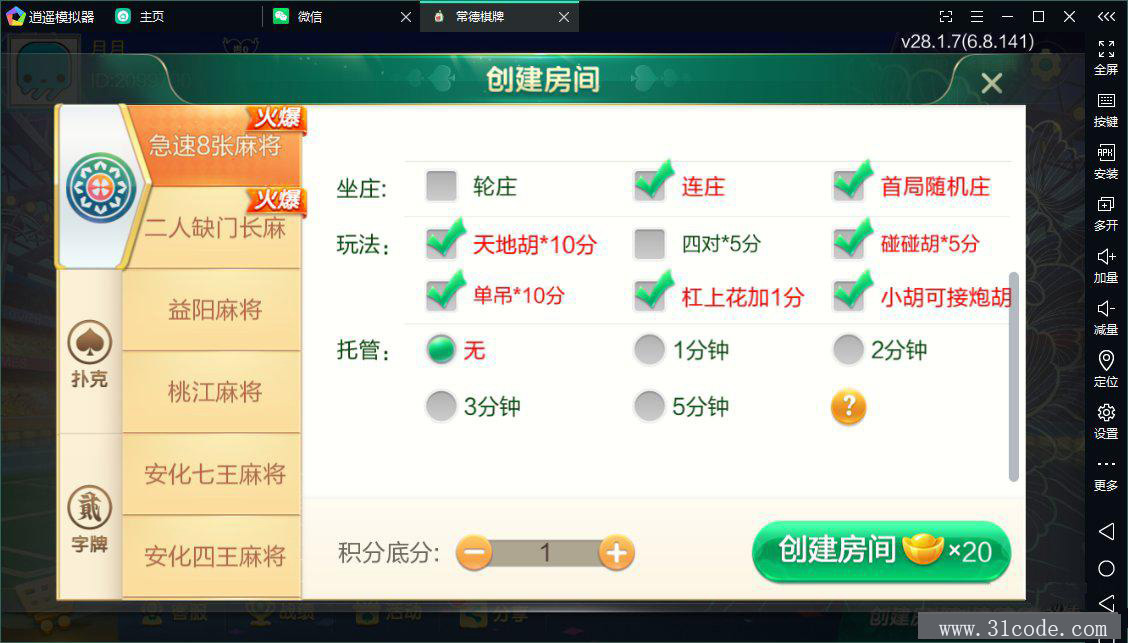 麻将:急速8张麻将,二人缺门长麻,益阳麻将,桃江麻将,安化四王麻将,安化七王麻将,红中麻将,沅江麻将,长沙麻将,转转麻将,炒股麻将