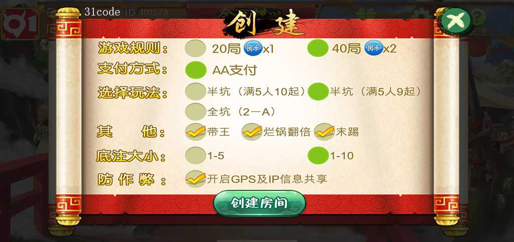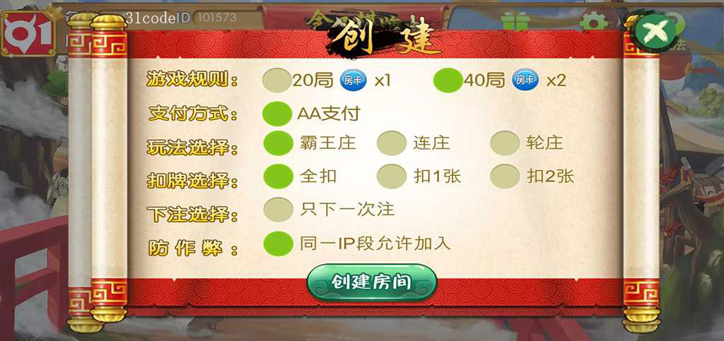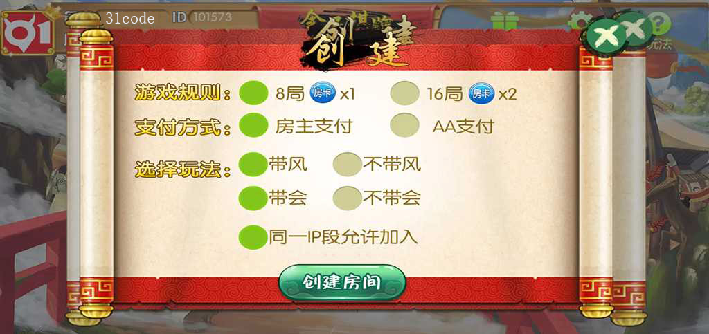 游戏玩法将使用房卡模式进行,大厅菜单含有玩家活动项目、帐号设置、玩法规则浏览等选项。