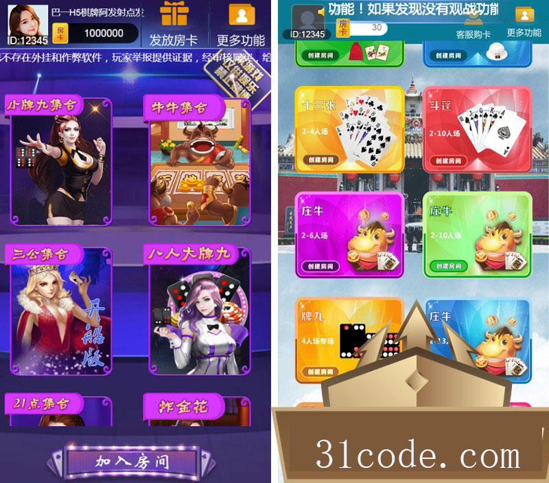 这是一款全开源的H5棋牌源码,内含12款子游戏。数据库和代码都是完整的,但代码有点乱,需要建立好几个数据库,数据库连接信息也需要修改多处文件。后台能完美运行起来,由于前台需要认证公众号的支持才行。所以无法正常登陆,也就不能测试功能是否完整。有技术跟条件的朋友可以下载研究,完全小白就不要下载了。
