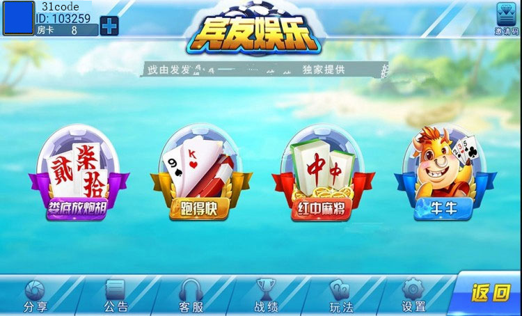 宾友棋牌房卡合集游戏组件 含4个游戏 娄底放炮胡 跑得快 红中麻将 牛牛,每个游戏都含多种玩法。