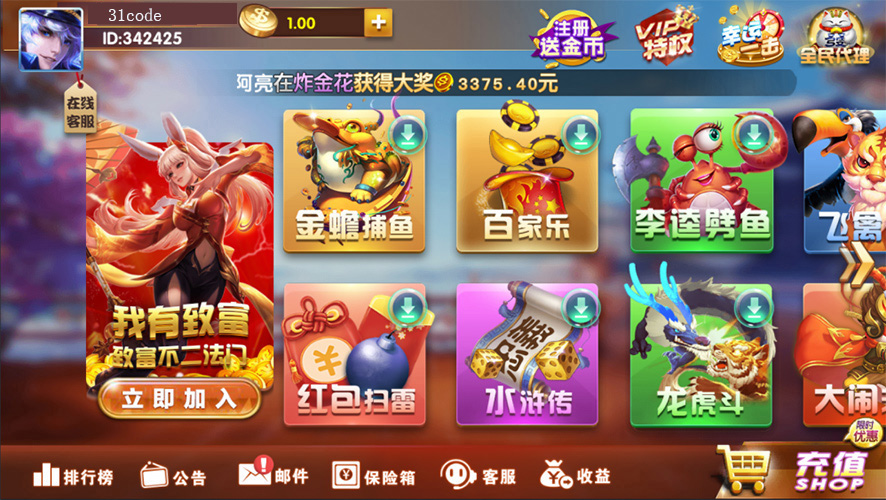 捕鱼游戏:金蝉捕鱼、李逵劈鱼、寻龙夺宝、大闹天宫