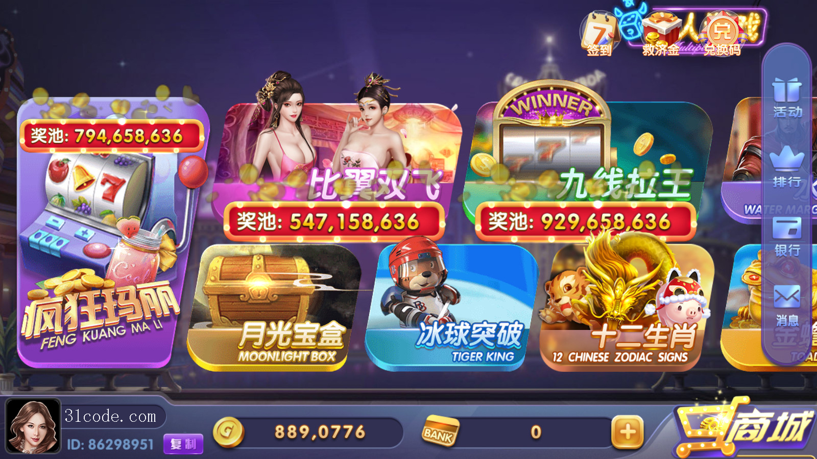 此电玩平台子游戏:比翼双飞,月光宝盒,九线拉王,冰球突破,十二生肖,水果玛丽,水浒传,金蟾捕鱼,财神来了,秘鲁传说,金瓶梅,埃及寻宝,飞禽走兽,茅山道士,森林舞会,寻宝乐园,财神献礼,摇钱树,大闹天宫,四人牛牛,通比牛牛,奔驰宝马,红黑大战,龙虎斗,水果拉霸