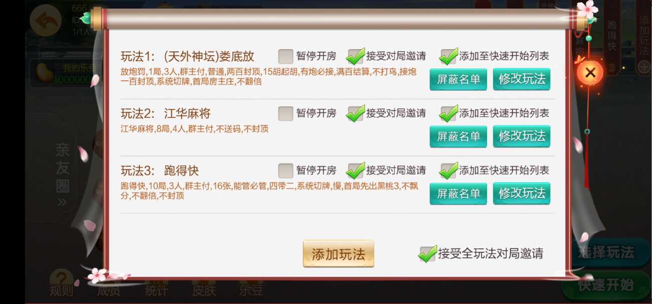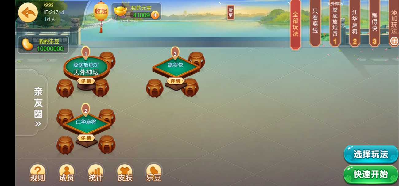 亲友圈专门改的乐豆模式,还有钻石模式和比赛模式,东西非常不错全网独家放端。下面的游戏这个板块我就懒得去筛选了,反正有一半,你们看城市名就知道分辨了。
