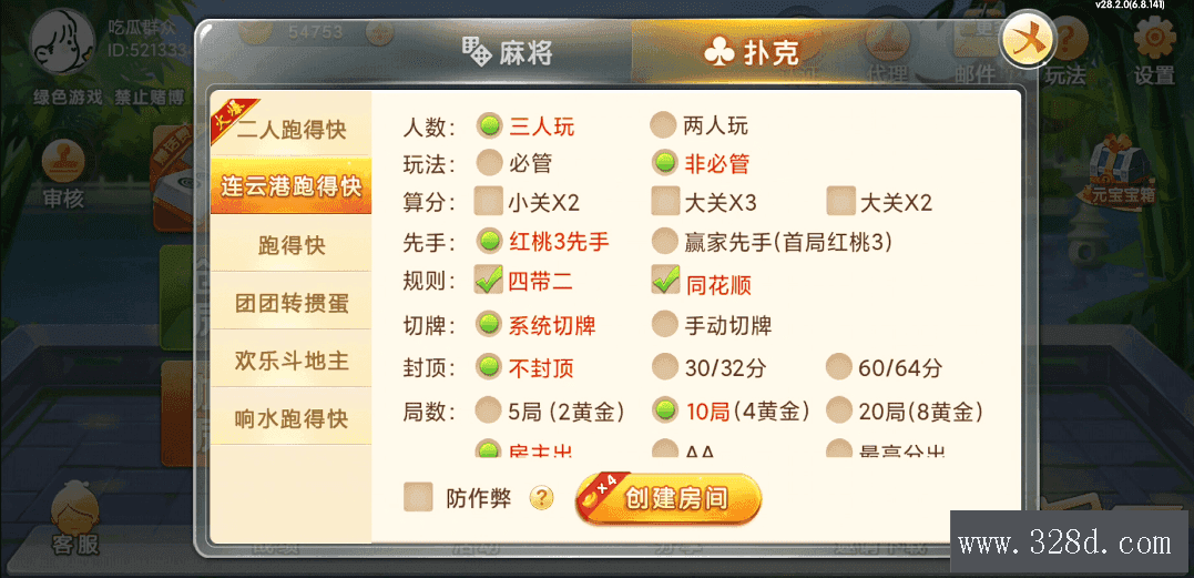 扑克:二人跑得快、连云港跑得快、团团转掼蛋、响水跑得快、徐州跑得快、欢乐斗地主