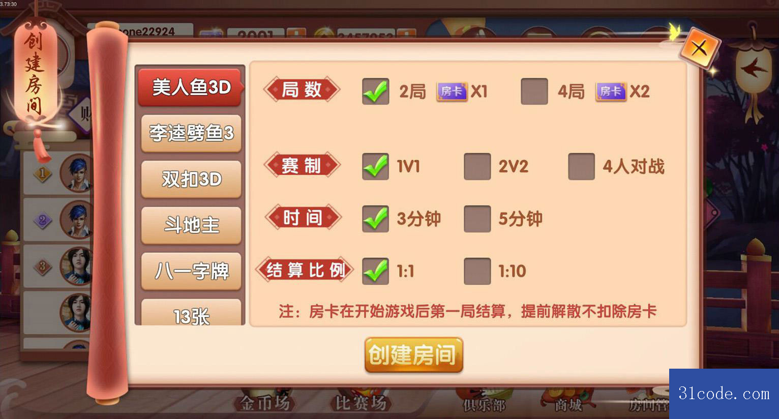 红鸟3D版房卡系列,UI卡通类型,新增捕鱼房卡类型,