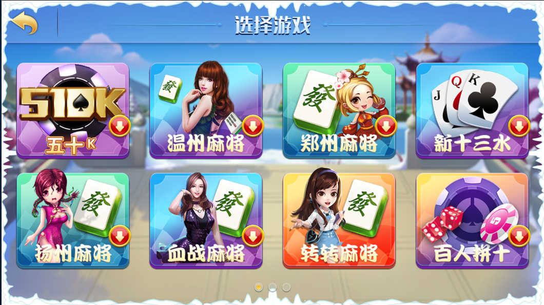 里面有:510K,温州麻将,郑州麻将,扬州麻将,血战麻将,转转麻将,新十三水,百人拼十,炸金花,比鸡,红中麻将,血流成河,广东麻将,大庆麻将,本溪麻将,万安麻将,抚州麻将,斗地主。