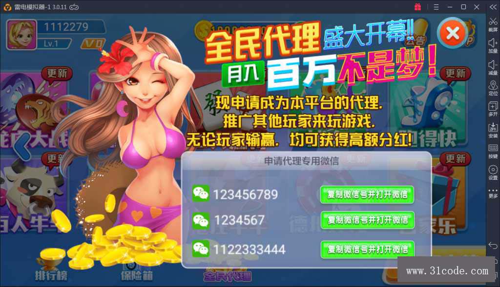 这是全新二次开发版本,火萤仿蓝月版,附带全民代理系统,以及游戏增加特效、聊天表情,支持多款游戏,分别为zhajin花、财神到、庄闲百家乐、跑得快、红黑大战、捕鱼、龙虎大战、二人麻将、抢庄牛牛、斗地主、百人牛牛、德州扑克等十二款热门游戏,其中百家乐游戏按照菠菜开奖,进行了二次开发配有路单,版本比较完整,管理后台功能齐全,包括有数据统计、兑换审核、会员管理、数据分析、公告更改、代理管理等功能,平台还可以支持提现兑换申请,程序组件包括:服务端,安卓、苹果客户端,网站,配置工具,脚本代码,数据库。配套的搭建视频已打包附在资源包里。