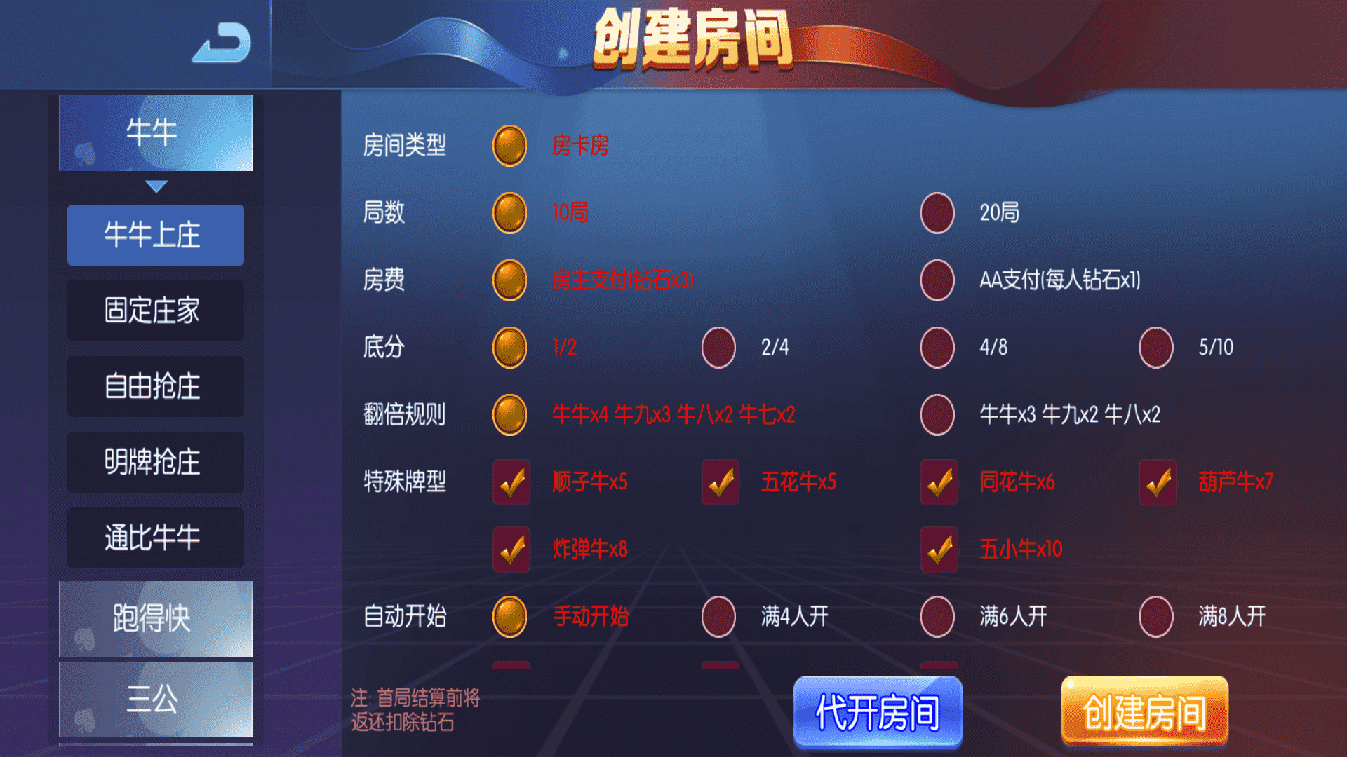 内含游戏:德州扑克、牛牛、斗公牛、跑得快、三公、扎金花、十三水、红中麻将、斗地主、血战麻将、山西推倒胡、点子牛、百人场里有龙虎斗、百家乐、推筒子、红包扫雷