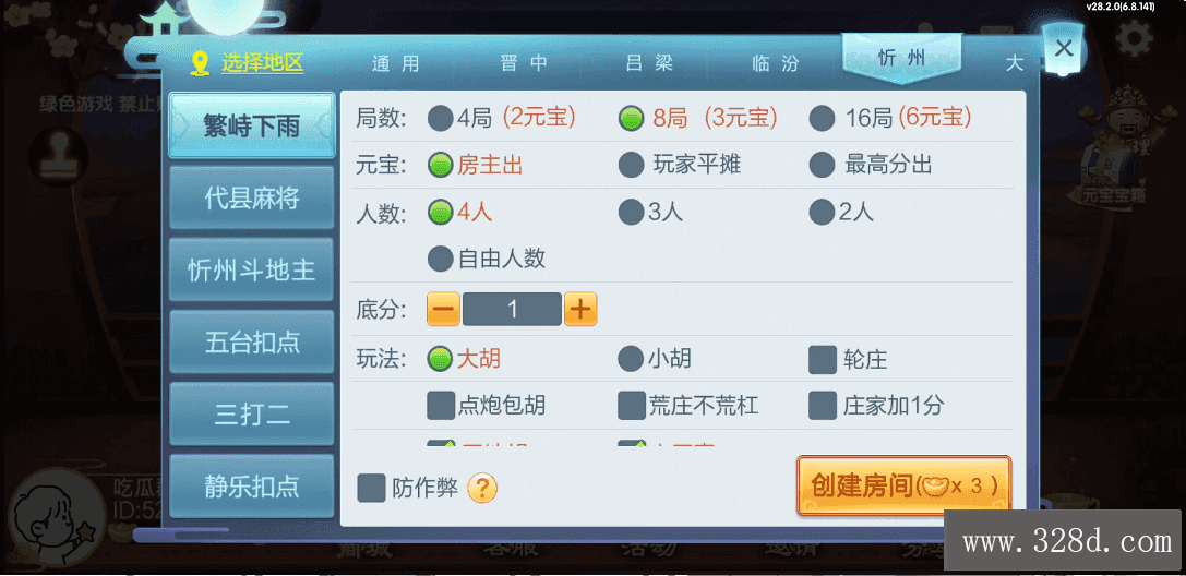 忻州:繁峙下雨、代县麻将、忻州斗地主、五台扣点、三打二、静乐扣点、